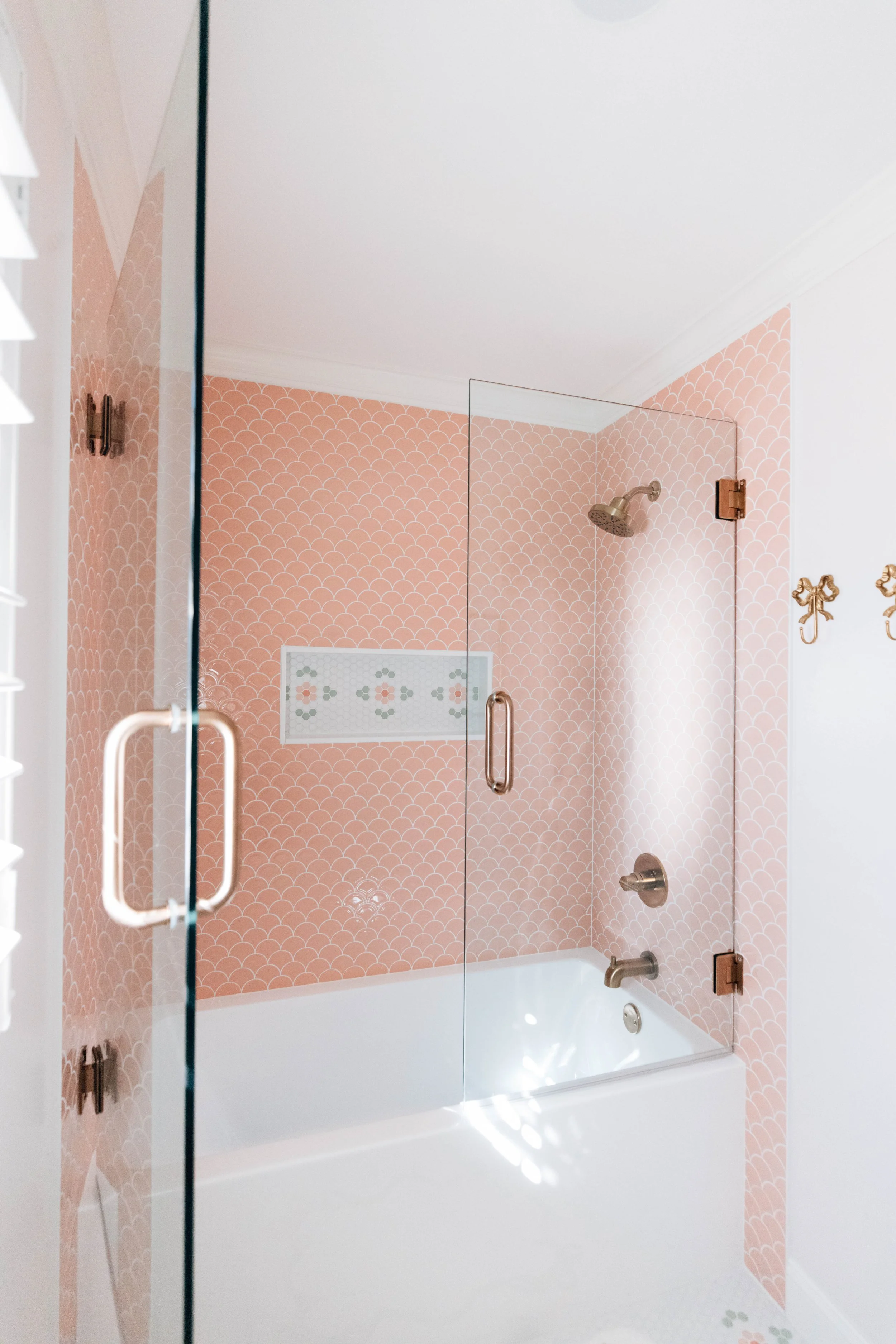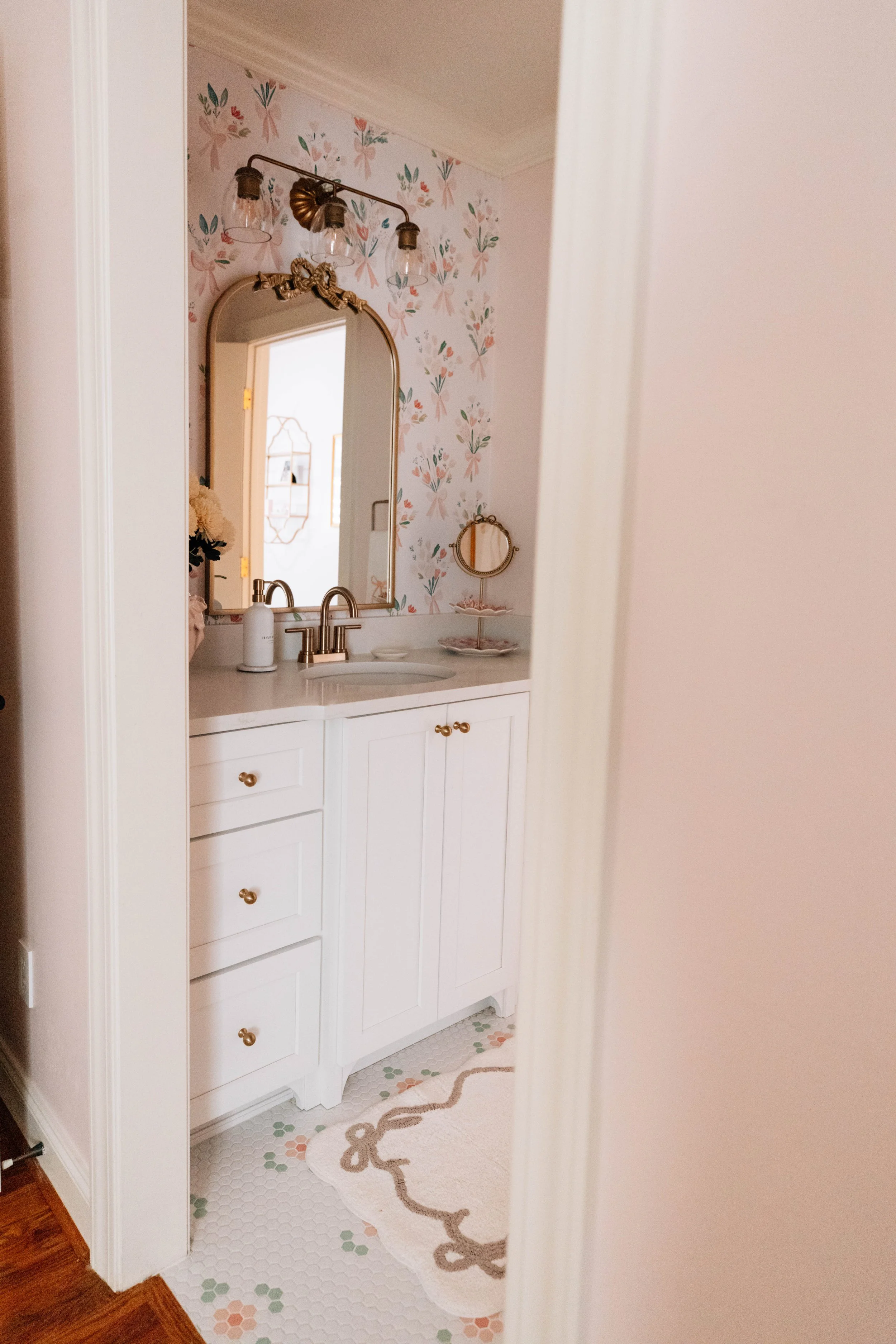 Custom cabinetry maximizes storage while maintaining a clean, tailored look, and a unique tile selection brings in visual interest and personality. Statement lighting adds just the right amount of sparkle—creating a bathroom that feels both practical for everyday use and elevated enough to feel like a special retreat.